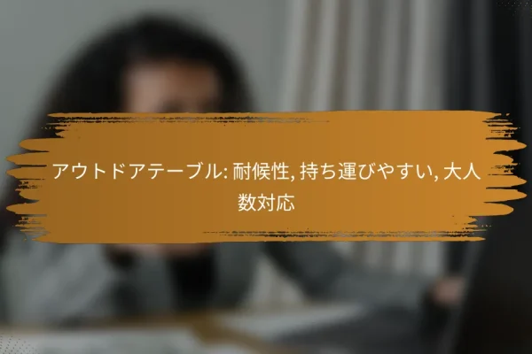 アウトドアテーブルは、耐候性に優れ、持ち運びやすい設計が特徴です。キャンプやピクニック、大人数の集まりなど、さまざまなシーンで活躍し、快適な屋外体験を提供します。適切な素材を選ぶことで、長期間にわたり使用できる耐久性を確保できます。 アウトドアテーブルとは何か? アウトドアテーブルは、屋外での使用を目的としたテーブルで、耐候性や持ち運びやすさが求められます。キャンプやピクニック、大人数の集まりなど、さまざまなシーンで活躍します。 アウトドアテーブルの定義と用途 アウトドアテーブルは、屋外での食事や作業のために設計されたテーブルです。軽量で耐久性があり、持ち運びやすいことが特徴です。 主な用途には、キャンプ、バーベキュー、ピクニック、フェスティバルなどがあり、特に大人数での利用に適しています。 アウトドアテーブルの主要な素材 アウトドアテーブルは、主にアルミニウム、プラスチック、木材などの素材で作られています。アルミニウムは軽量で耐久性が高く、プラスチックは手入れが簡単です。 木材は自然な美しさがありますが、耐候性を高めるために適切なコーティングが必要です。素材選びは、使用シーンに応じて考慮することが重要です。 アウトドアテーブルのサイズと形状 アウトドアテーブルのサイズは、通常、2人から8人以上のグループに対応できるものがあります。長方形、円形、折りたたみ式など、さまざまな形状が存在します。 選ぶ際は、使用する人数やスペースに応じて適切なサイズを選ぶことが大切です。特に、収納や持ち運びを考慮した折りたたみ式が人気です。 アウトドアテーブルのデザインのバリエーション アウトドアテーブルには、シンプルなデザインから、収納機能や調整機能を備えたものまで多様なスタイルがあります。デザインによって、機能性や美しさが異なります。 また、カラーバリエーションやアクセサリー(例えば、カップホルダーや収納ポケット)も豊富で、個々の好みに合わせて選ぶことができます。 耐候性のあるアウトドアテーブルを選ぶには? 耐候性のあるアウトドアテーブルを選ぶ際は、素材や設計が重要です。雨や風、紫外線に耐えることができるテーブルを選ぶことで、長期間使用できるでしょう。 耐候性の重要性とその理由 アウトドアテーブルは、屋外での使用が前提のため、耐候性が不可欠です。耐候性がないと、天候の影響で劣化しやすく、使用寿命が短くなります。 特に、雨や直射日光にさらされると、木材は腐食し、金属は錆びる可能性があります。耐候性のあるテーブルを選ぶことで、これらの問題を回避できます。 耐候性素材の種類と特徴 耐候性のあるアウトドアテーブルには、主にプラスチック、アルミニウム、ステンレススチール、そして耐候性の木材が使用されます。プラスチック製は軽量で持ち運びやすく、アルミニウム製は錆びにくい特性があります。 ステンレススチールは非常に耐久性が高く、長期間の使用に適しています。耐候性の木材は、見た目が美しく、自然な風合いを保ちながらも、適切な処理を施すことで耐久性を向上させることができます。 耐候性の評価基準 耐候性を評価する基準には、耐水性、耐UV性、耐腐食性などがあります。これらの基準は、テーブルがどれだけ厳しい環境に耐えられるかを示します。 例えば、耐水性は水分が素材に浸透するのを防ぐ能力を示し、耐UV性は紫外線による劣化を防ぐ性能を示します。これらの評価基準を確認することで、適切なテーブルを選ぶことができます。 耐候性のテスト方法 耐候性のテスト方法には、実際の環境での使用試験や、特定の条件下での耐久試験があります。例えば、雨水にさらしたり、直射日光に置いたりすることで、素材の反応を観察します。 また、塩水噴霧試験を行うことで、金属の耐腐食性を評価することもあります。これらのテスト結果を参考にすることで、耐候性の高い製品を見極めることが可能です。 持ち運びやすいアウトドアテーブルの特徴は? 持ち運びやすいアウトドアテーブルは、軽量でコンパクトに折りたためる設計が特徴です。これにより、キャンプやピクニックなどのアウトドア活動で簡単に持ち運ぶことができます。 軽量素材の選び方 持ち運びやすいアウトドアテーブルには、アルミニウムやプラスチックなどの軽量素材が適しています。これらの素材は強度がありながらも軽量で、持ち運びが楽になります。 特に、アルミニウム製のテーブルは耐久性が高く、長期間の使用にも耐えられます。選ぶ際は、素材の強度と重量のバランスを考慮しましょう。 折りたたみ機能の利点 折りたたみ機能は、持ち運びやすさを大幅に向上させます。使用しないときはコンパクトに収納でき、車のトランクやバックパックにも収まります。 折りたたみテーブルは、設置も簡単で、数秒で準備が整います。この機能は、特に移動が多いアウトドアシーンで重宝します。 持ち運